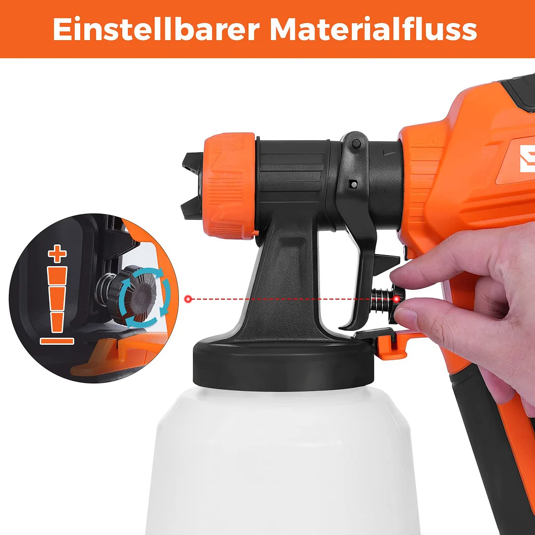 【Advanced Technology & Design】The 700W high-power motor is more efficient. Maximum viscosity upgraded to 120 Din-s. The spraying effect is greatly improved, and a smooth and high-quality paint surface can be sprayed. The paint output can be controlled by adjusting the flow control knob. Spray guns are suitable for various projects, which can spray corners that rollers can't reach.