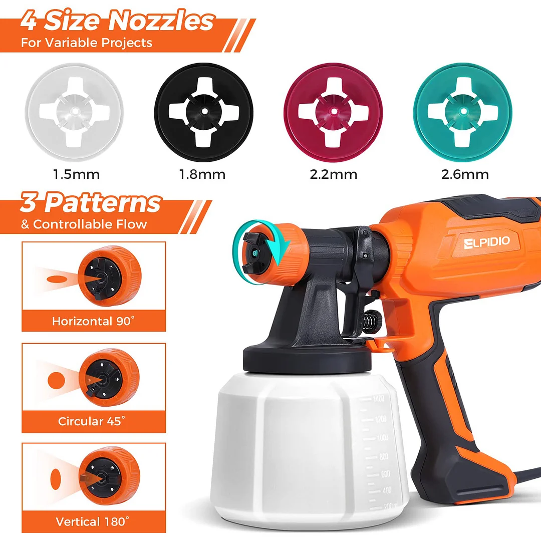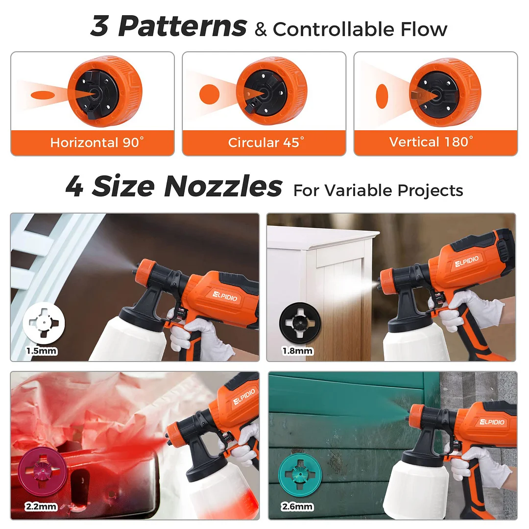 【6 Nozzle Sizes & 3 Spray Patterns】ELPIDIO 700W paint sprayer comes with 6 size nozzles (1.2mm, 1.5mm, 1.8mm, 2.0mm, 2.5mm, 3.0mm), which can be adjusted to three spray patterns (horizontal, vertical and circular). Multiple nozzle sizes and adjustable spray patterns allow for a wide range of scenarios, making it ideal for various paint spraying projects, such as furniture, fences, decks, pickups, etc.