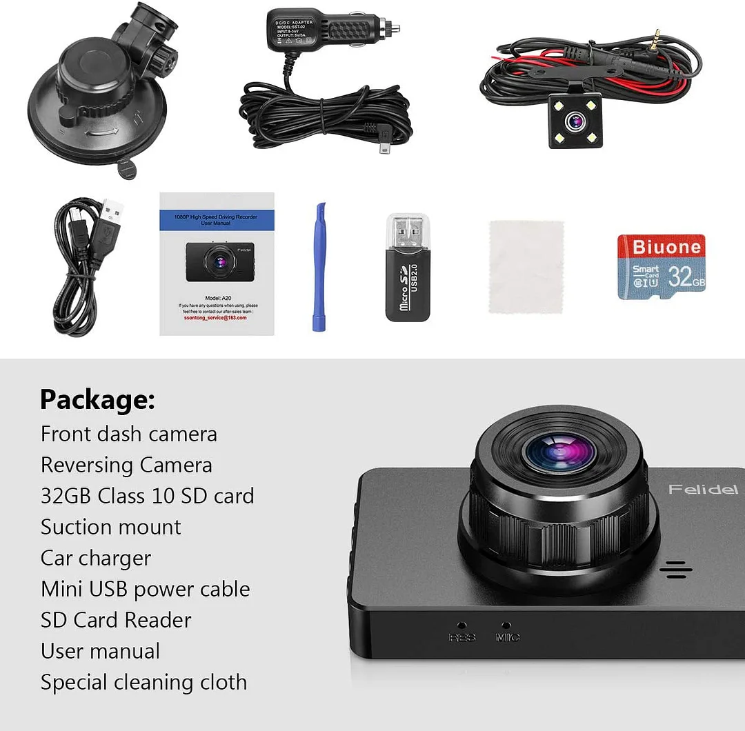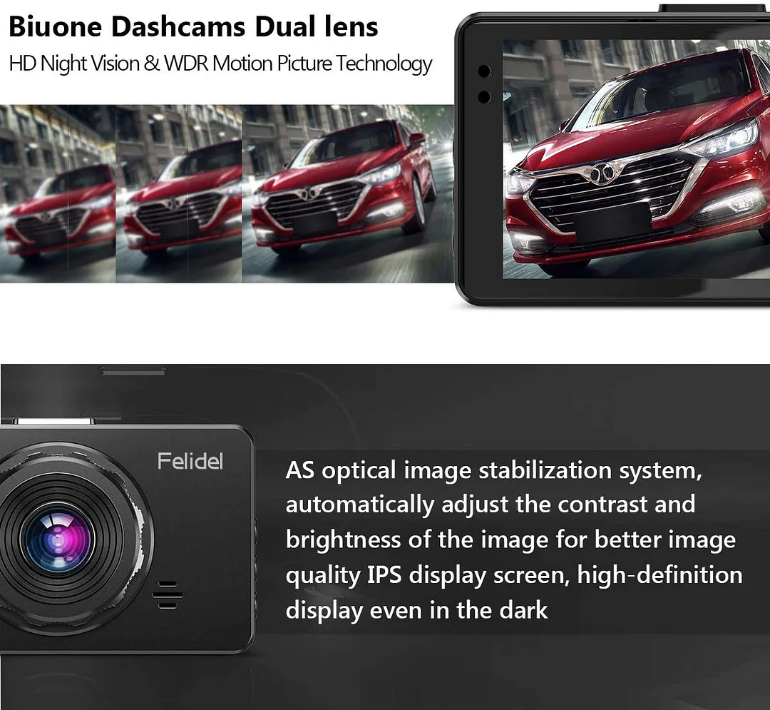 🛍️ 【1080P Full HD Dash Cams with USB Port】Car camera charger with USB port , 👉 no worry about the charging problems of mobile phones/mobile electronic devices even thought using this dual dash cam. Combines the f1.8 aperture and WDR tech, you can playback each clear detail on car dash cam or PC. 🛍️ 【Car Cameras with 32G SD Card】3 Inches IPS Screen car on-dash mounted cameras with 32GB SD card can endless working under Loop Recording function. 👉 No worry about this dash cam front and rear will full of storage! Dash cam front and back combined with So ny sensor, you will get 30fps videos and 12MP pictures with this dashcams for cars front and rear. 🛍️ 【Wide Angle Front and Rear Dash Cam】Dash cam front comes with 170°wide field of vision and 140° for dash cam rear. Ultra-wide field of car cameras reduces the blind spots and captures more details, aslo, 👉 there are 4 lens switching method that you can choose, security camera for car. 🛍️【G-sensor On Car Camera - Dash Cam Front and Rear】Our car safety camera can auto detect and lock the driving recording that we need. Truly restored the driving video/photo with highly sensitivity. 👉 You can also set the camera for car to turn off the screen auto but still keep recording. (30seconds/1Min/2Min) 🛍️【Plug and Play Front Dashcam for Car】You will find that you can easily and securely mount the suction cup to your windshield in seconds. This car dash camera's operation is still simple and friendly for new users. If you don't need the Reversing Mode, ther rear camera also can be very easily, just install and hide the wire. 👉 Please note, use the needble to insert the little hole on the " RES" botton, you can rest the factory setting, can fix the freeze /or other little questions well. 🥰 🥰 Installration of Dual Dash Camera - Rear Cam Cable : Way 1: Connect the red part of rear cable with the positive pole of reversing light, so that it will appear reversing mode when you parking, No recording when you reversing. Way 2: If your car already have built in reversing system monitor, NO NEED TO CONNECT THE RED WIRE, Just wrap it directly with tape. Install and hide the cable is ok! At this period, the rear camera can keep recordking at reversing peroid. 🥰 🥰 Front and rear dash cam with 32G SD Card, already inserted in Dash Car Camera. As a seller of dash cam and suppliers of other car camera sellers, we have collected the earliest data and feedback to upgrade our products, improve problems, and provide a 100-point great after-sales experience. or you can get the longer extension cable for the rear camera if you need it.( it is 6M's rear cam cable in the package) Please trust us, trust your choice.