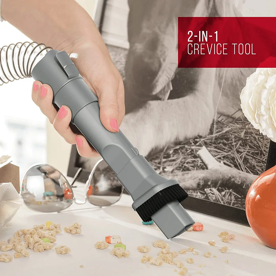 CONVENIENT ON-BOARD STORAGE: Easily maneuver corners and tight spaces using the 2-in-1 dusting brush and crevice tool with convenient on-board storage for tackling messes at a minute’s notice