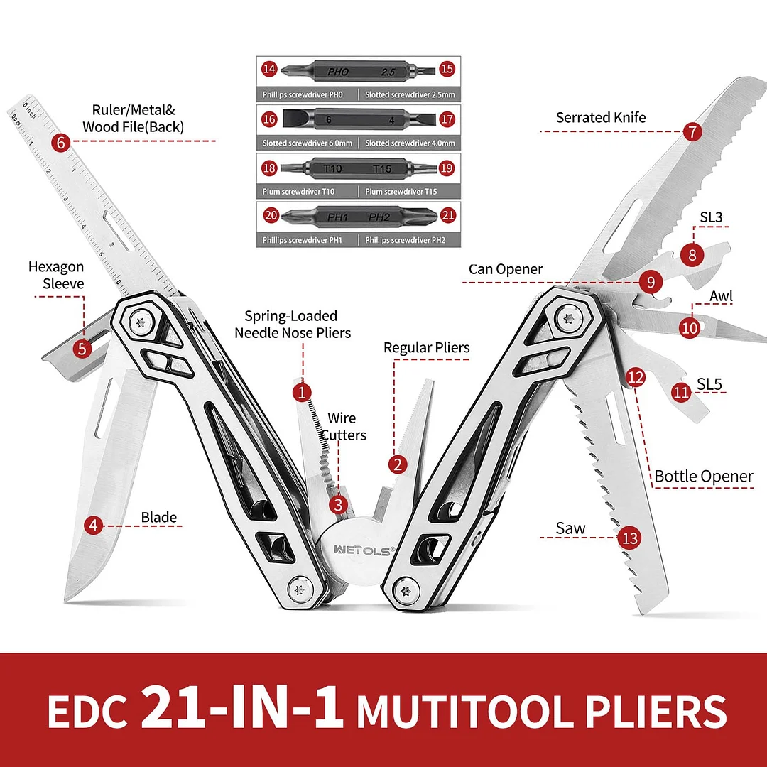 21-in-1 Versatility – This multitool pocket knife includes pliers, wire cutters, blades, screwdrivers, saw, file, bottle & can openers, and more for all tasks.