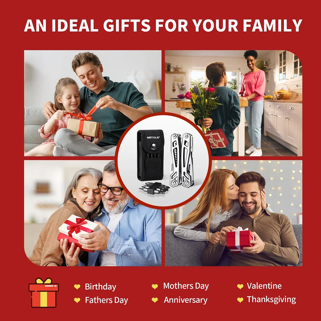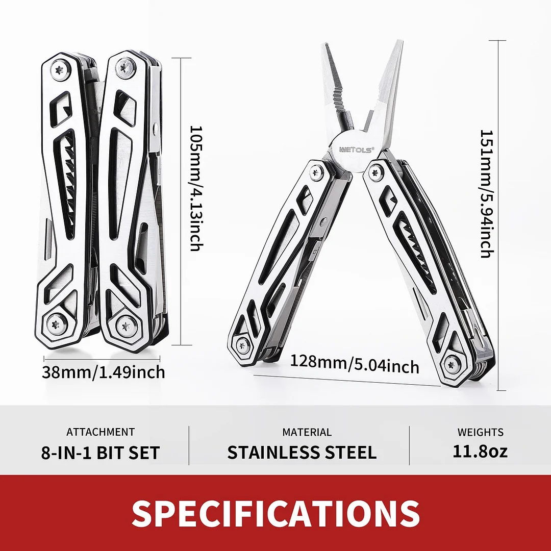 Special Features:Needle-nose plier, Combination pliers, End cutting pliers, Blade, Hexagon sleeve, Scale, Sickle, Rope-cutting knife, Bottle opener, Slotted screwdriver, Hole puncher, Can opener, Mini slotted screwdriver; 4x bits x2 functions;