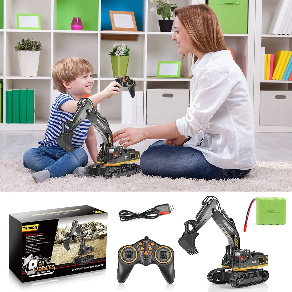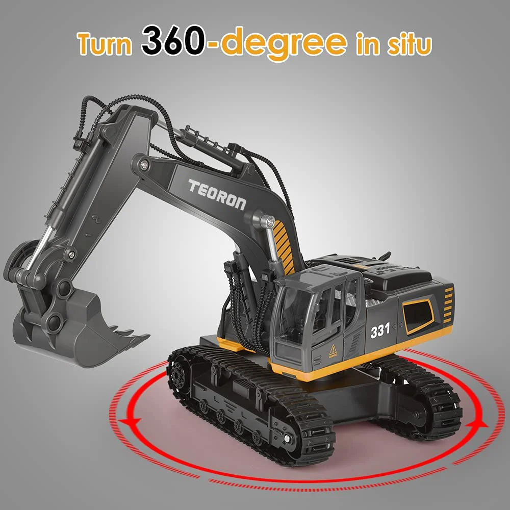 【Full Functional RC Excavator】This 9 Channel remote control truck can go forward/backward or turn left/right. It has 360 degree rotating table and one button auto demonstration function to help kids learn how to operate, increase interest and give them a better enlightenment.