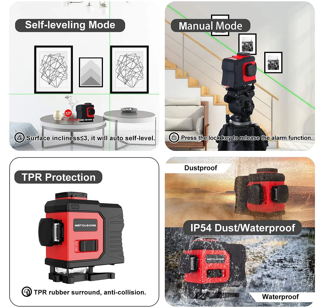 【Multifunctional Design & Durable Material】With the smart pendulum system, when pendulum unlocked, this device can self-level and indicate out-of-level condition; when locked, it switches to manual mode to lock lines for use at any angle. IP54 waterproof / dustproof. All sides and corners are protected by TPR soft rubber, so that the laser level has excellent impact and abrasion resistance.