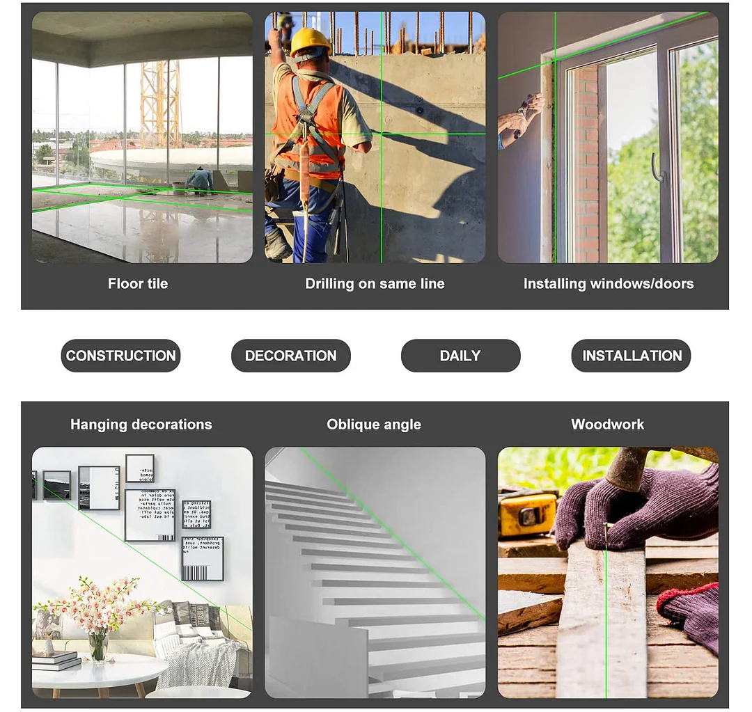 【High Visibility & 3 x 360° Line Lasers】We use the green laser beam, which is 4 times brighter than the traditional red laser. A horizontal line and two vertical lines can rotate 360 degrees to cover the floor, walls, and ceiling of the entire room. Two vertical lines intersect at a 90 ° angle, allowing users to quickly visualize and complete the square layout. Laser Power: <5mW, CLASS II.
