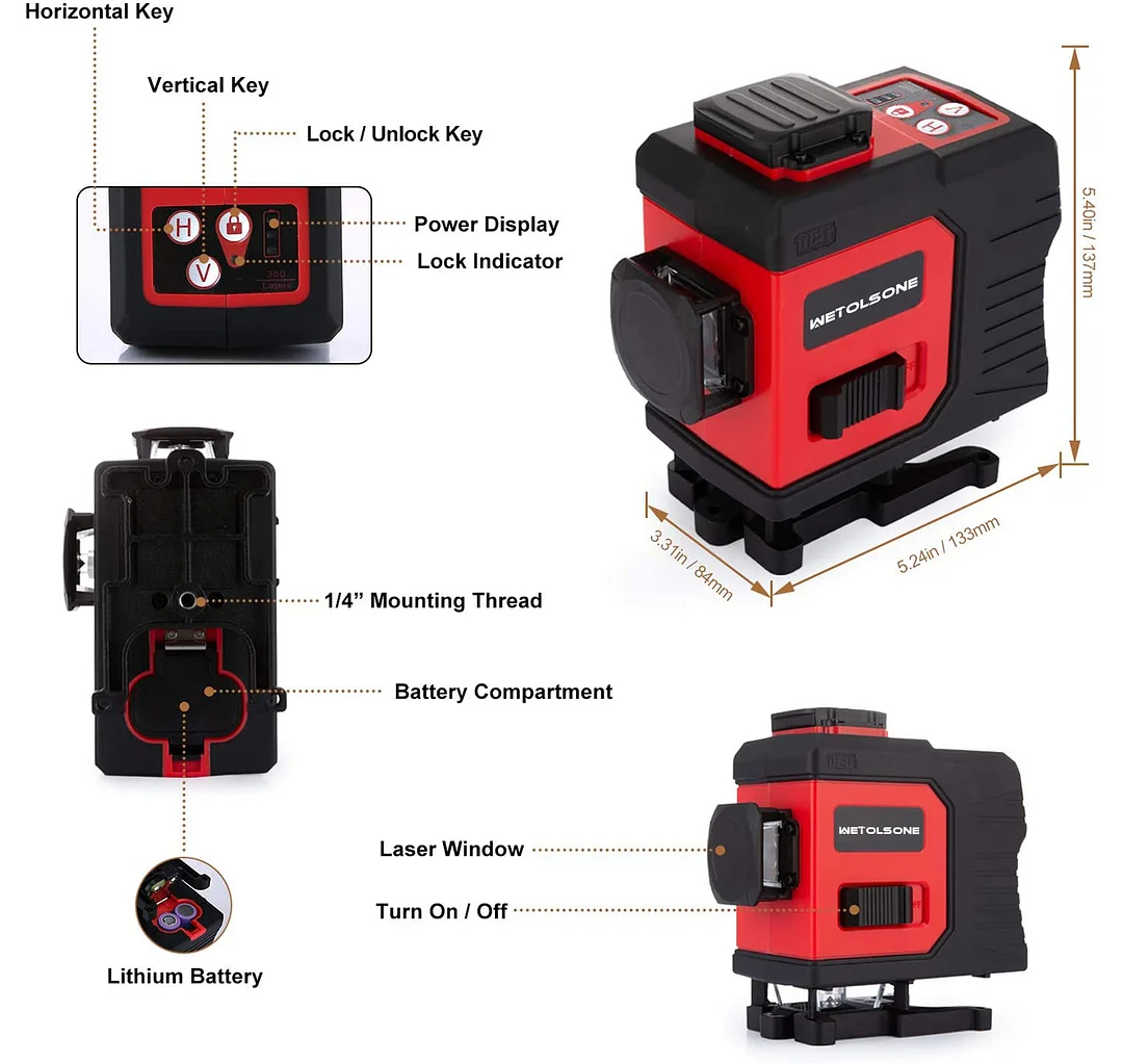 【Package Contents】1X Laser Level, 1X Magnetic Fine-Tuning Bracket, 1X Gasket, 1X Lifting Base, 2X Batteries, 1X Battery Charger, 1X Laser Target Plate, 1X Adapters, 1X Remote Control, 1X Triangle Bracket Connector, 1X User Manual, 1X Hard Carrying Case.