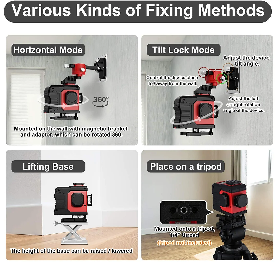 【Multiple Installation Methhods & Widely Application】The included strong magnetic bracket enables to be attached to metal surfaces on the wall and turn the laser level around at 360°, also offers 1/4" mounting threads on the bracket and the device to suit for standard tripod or pole mounts. Ideal for paving tiles, installing photo, door, window, or furniture, hanging wallpaper, painting etc.