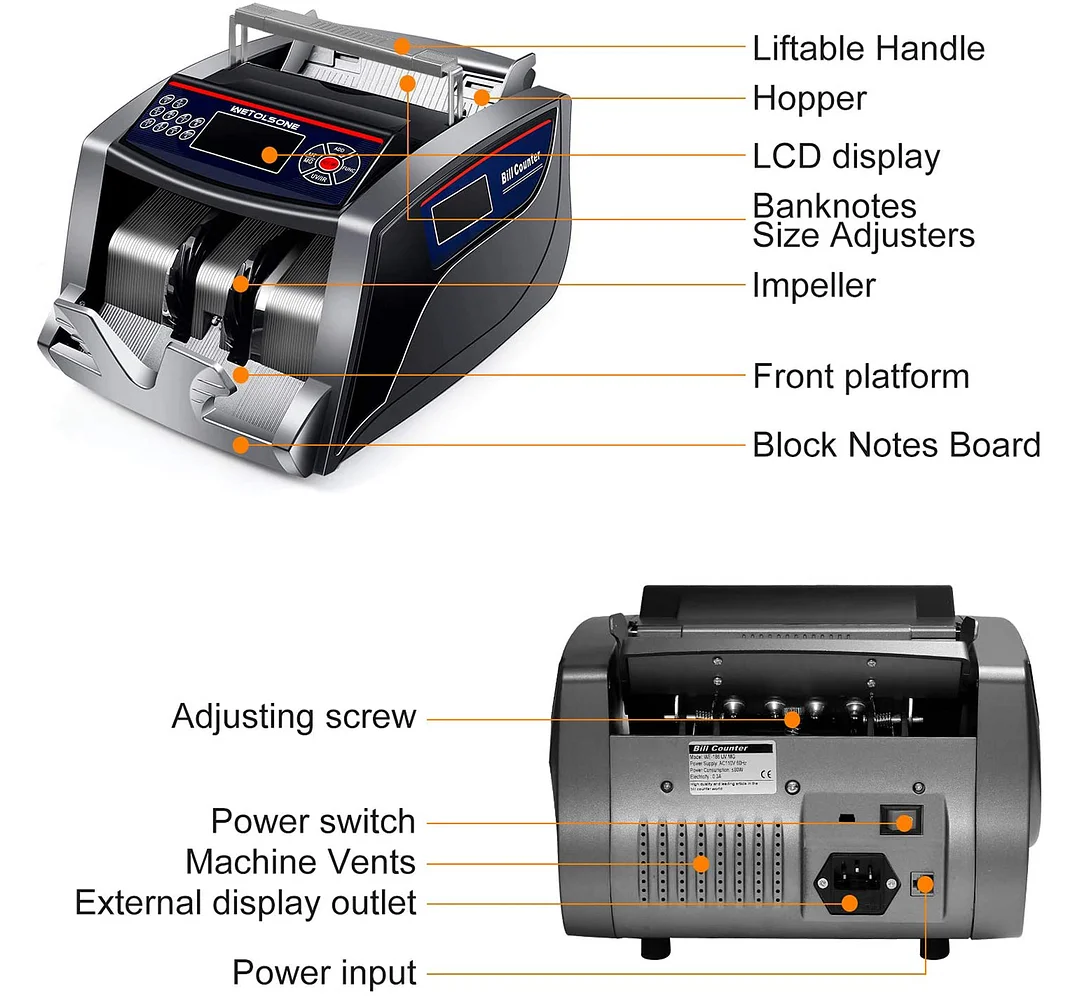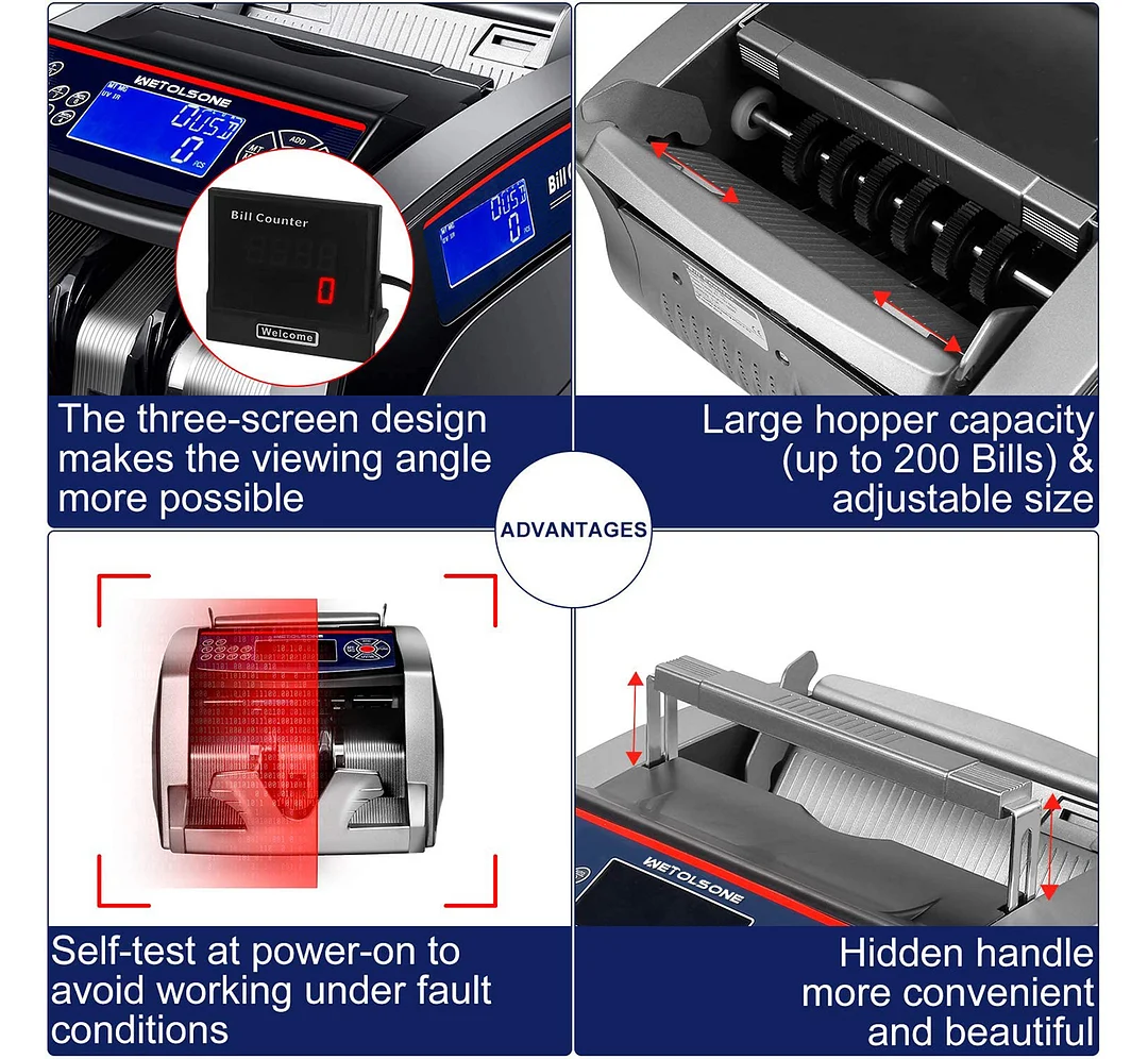 【Three-Screen Design, External Display With More View Angles】Dual LED screens (front and side), you can more easily take readings from multiple angles; the counter also has an additional external display that can show customers how you are counting. With a portable handle, which can be hidden directly, brings you more beauty and convenience. Applicable to most currencies in the world.