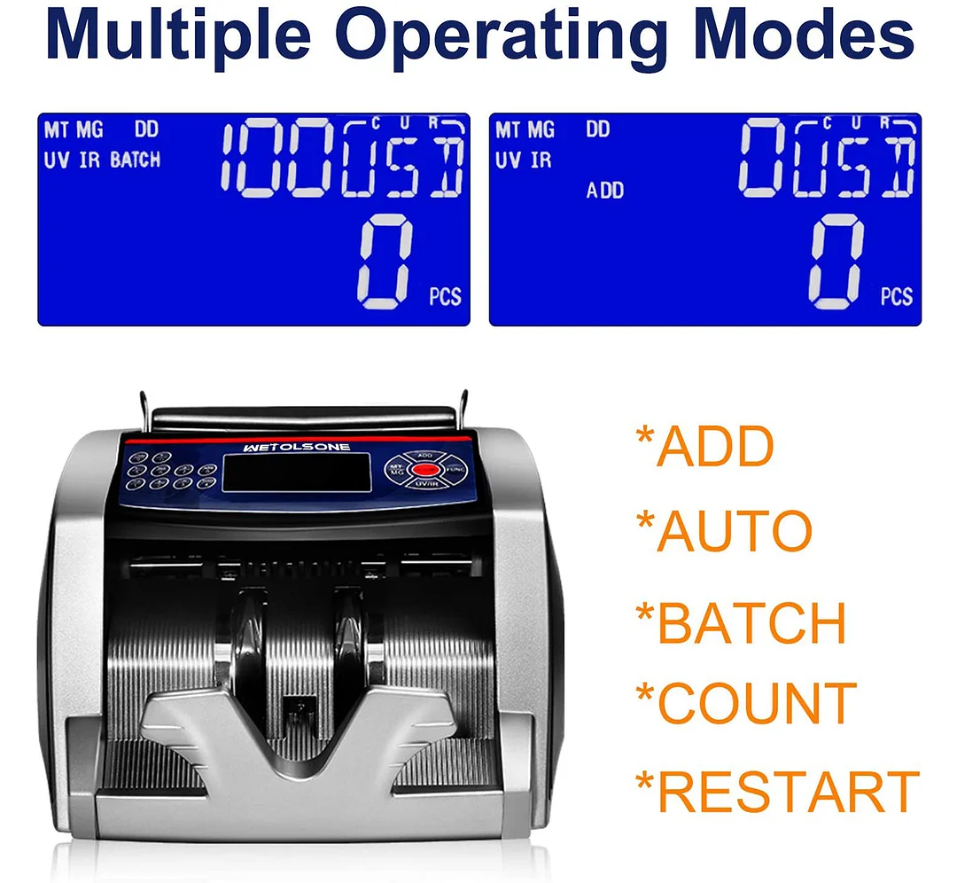 【Convenient 5 Operations Modes】Count, Add, Batch, Restart and Auto mode, make the function more extensive. Count mode: count currencies' quantity; Add mode: count the sum of added bills; Batch mode: count bills in batches; Restart mode: clear zero and restart; Auto mode: switch between auto and manual mode when counting. Low noise, below 60DB, it will not disturb people.