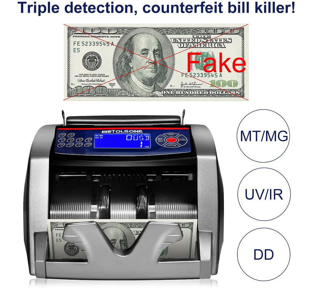【Accurate Counting & Triple Anti-Counterfeiting Detection】Five high-tech anti-counterfeiting detection methods can help detect counterfeit banknotes, Ultraviolet (UV), Infrared (IR), Magnetic (MG), Metal Thread (MT) and Dimensional (DD). The default function is that UV/IR and MT/MG are turned on at the same time and can be switched. Large hopper capacity can hold 200 currencies.