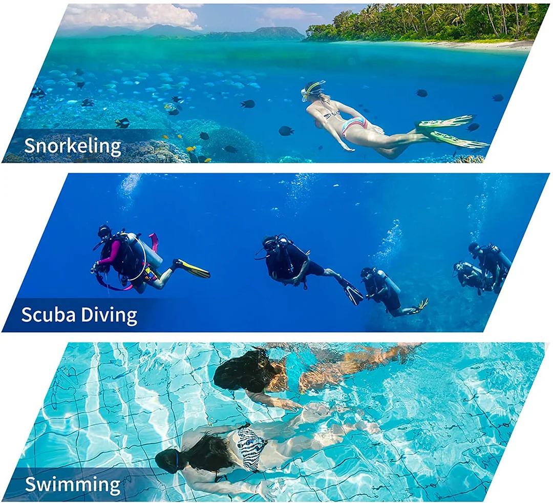 Anti-fog coating for clear viewing; tempered glass lens lasts longer than regular; Comfort-fit liquid silicone skirt for water-tight seal, Hypoallergenic silicone mouthpiece for comfort, epecially suitable for long-term use in free snorkeling.