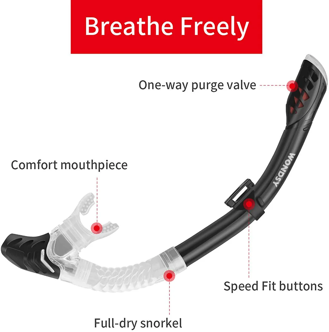 100% dry snorkel. This is great for those who are swimming in choppy waters or with kids around which eliminates any chance of surprise water entering the snorkel. This is a great safety feature, especially for those with families. A large purge valve makes cleaning this snorkel easy.